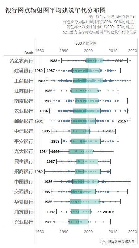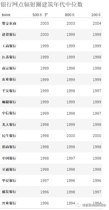 从网点辐射圈平均建筑年代来看,紫金农商行周边平均建筑年代最新,其次为建设银行、工商银行。兴业银行平均建筑年代最老。