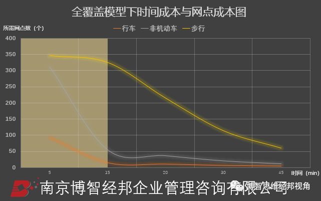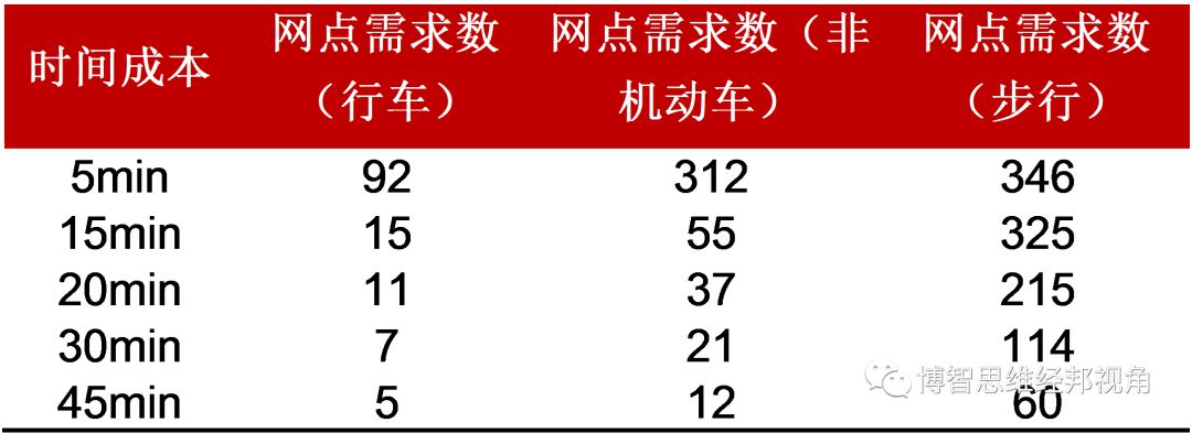 除了网点总量外,另一个被银行广为关注的问题,就是各种不同级别、类型的网点各自所应占的合理比例。虽然各家银行在网点类型命名上有各自的规则,但总体而言,可将网点类型分为以下三大类:以服务高端优质客户为主、辐射范围极广的旗舰型网点,以服务区域客群为主、辐射范围一般的普通网点和以服务周边客群为主、辐射范围较小的轻型网点。三类网点在辐射范围上存在明显差异。为此,在道路网络的基础上,在模型中引入了“时间成本”的概念,即居民前往网点所需的时间,而时间又与居民出行的交通方式有关。