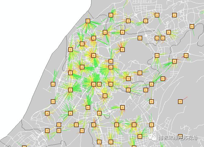 4、道路网络时间成本:建构道路网络时,按不同行车速度为道路赋予了不同行驶速度。国道1000m/min;省道833m/min;县道667m/min;市区道路500m/min。同时,步行速度、非机动车行驶速度按80m/min, 250m/min计算。