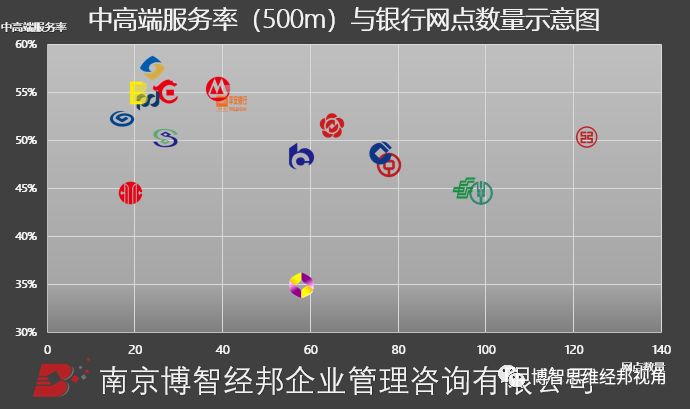 从各家行网点数量及中高端客户服务率(500米)来看,在网点资源有限的情况下,各家行均优先保证中高端客户服务。具体而言,工商银行在网点数量多的同时,仍保有很高的中高端客户服务率。但中信银行,在网点数量有限的情况,没能很好地把握中高端市场。而紫金农商行,在网点布局时充分地明确了核心市场定位,在选址布局上形成了差异化。
