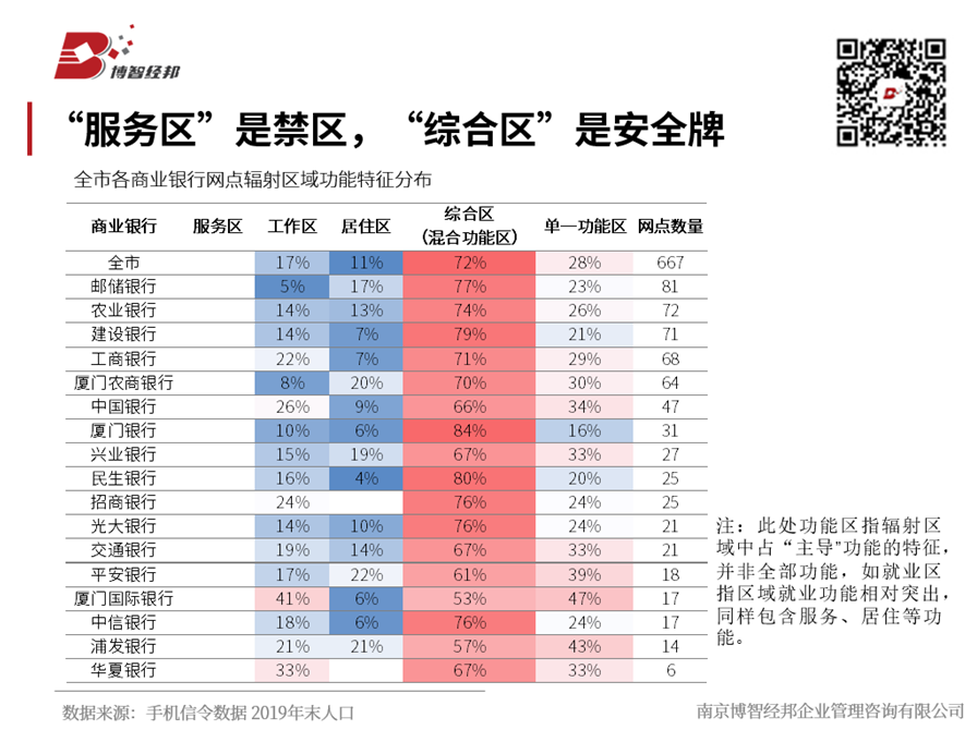 向诸位说明的是,从网点辐射区域的功能性质具有很强的“主观”色彩,一方面突出的是以银行网点自身为中心,而非自然地理功能区,无法将全市“完整”功能区图谱展现的情况下,区域之间容易形成一定的误导,另一方面,“综合区”在各个功能的分配上是一个暗箱。例如,网点在就业区的比例明显高于居住区,事实上并不意味着网点对居住功能的重视不及就业。事实上从功能度的偏好上,银行网点是“乐于”服务居民的,但在辐射主导的功能方面更偏向综合与就业,望诸位不要断章取义。