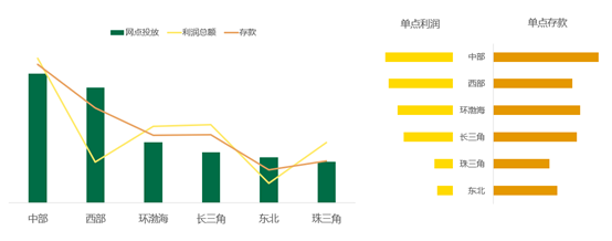 从地区自营网点经营数据来看,中部地区的网点高投放确实带来了相应的高利润和高存款,但网点投放比例较少的发达地区自营网点单点存款和利润却很高,这说明的是在发达地区投入一个网点比在中部地区投放一个网点会获得更高的利润,吸收更多的存款,中部地区并非增设网点的首选地区。